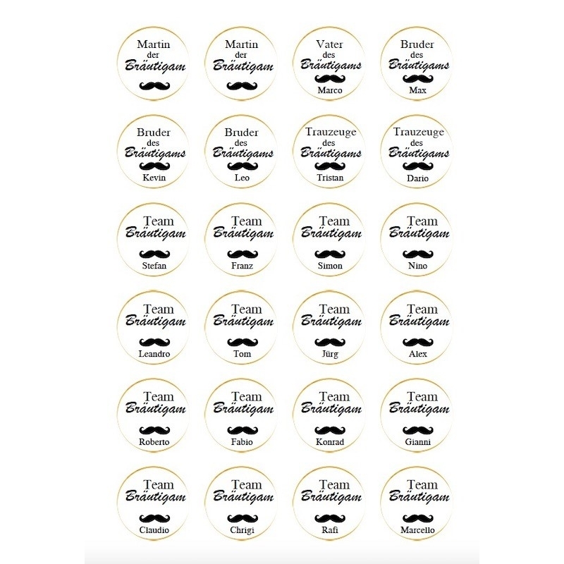 Personnalise les autocollants pour le marié, le frère/les frères, le père, le témoin et le premier membre de l'équipe. Au total, il y a 24 autocollants autocollants que tu peux personnaliser toi-même selon tes souhaits.