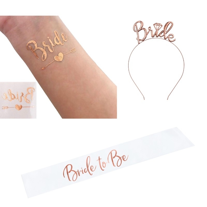 Le set comprend une serre-tête 'Bride', une écharpe en satin 'Bride to be' e et un tatouage 'Bride'.