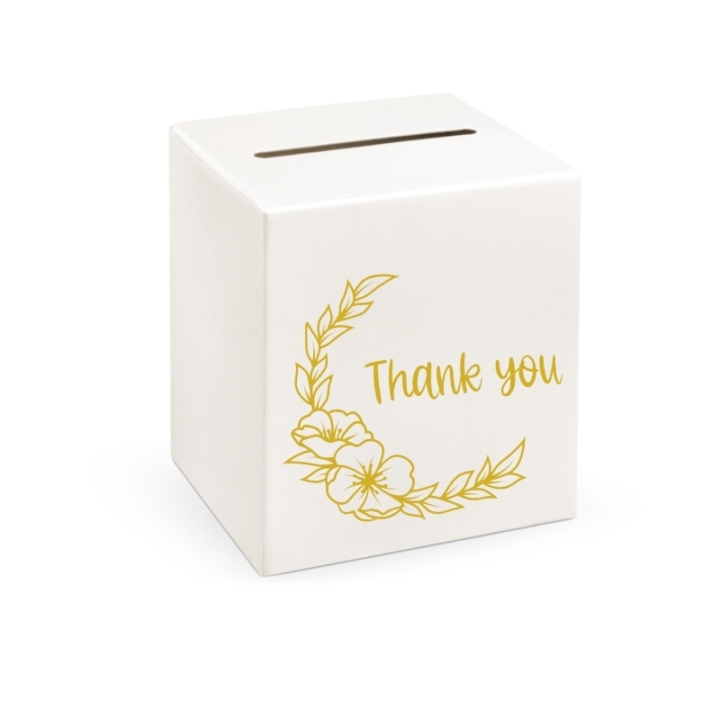 La combinaison d'une forme épurée, d'une surface blanche et d'un motif floral doré avec l'inscription « Thank you » fait de cette boîte un véritable accroche-regard. Le matériau robuste garantit que les cartes et les enveloppes sont conservées en toute sécurité, sans se plier ni tomber.