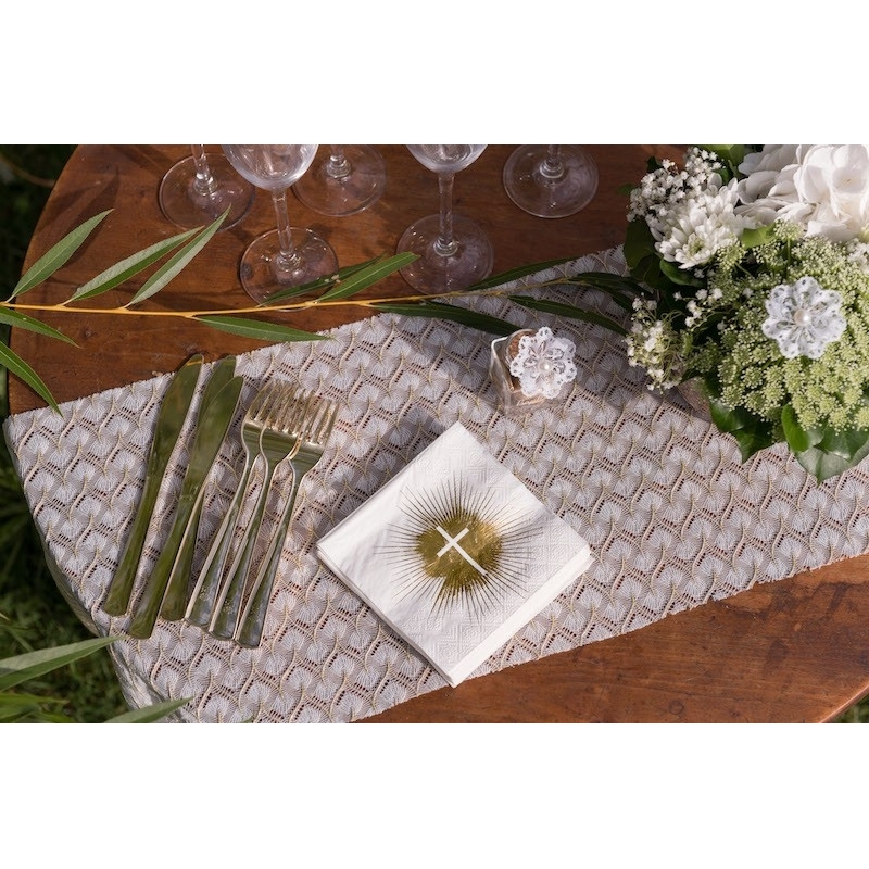 Voici une belle seviette de table « Communion » de couleur blanche et dorée métallisée avec un motif croix étincelante qui sera parfaite pour la décoration de ce jour de fête pour votre enfant.