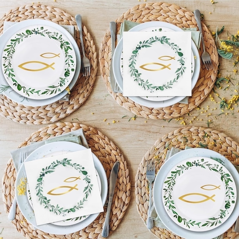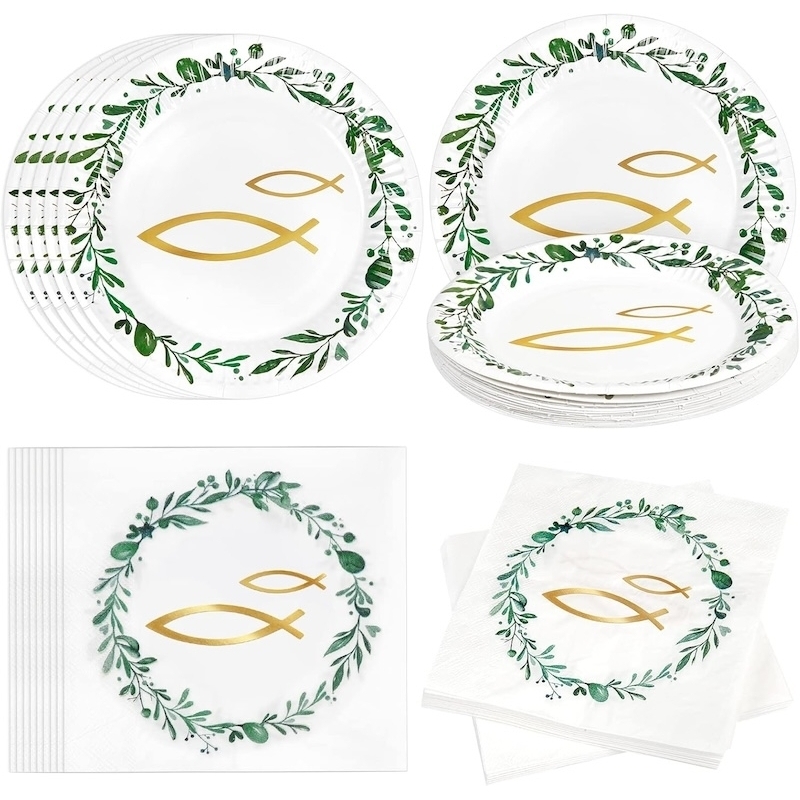 Ce set de vaisselle composé de serviettes de baptême et d'assiettes en carton vert olive convient parfaitement pour votre communion, votre confirmation ou votre baptême.